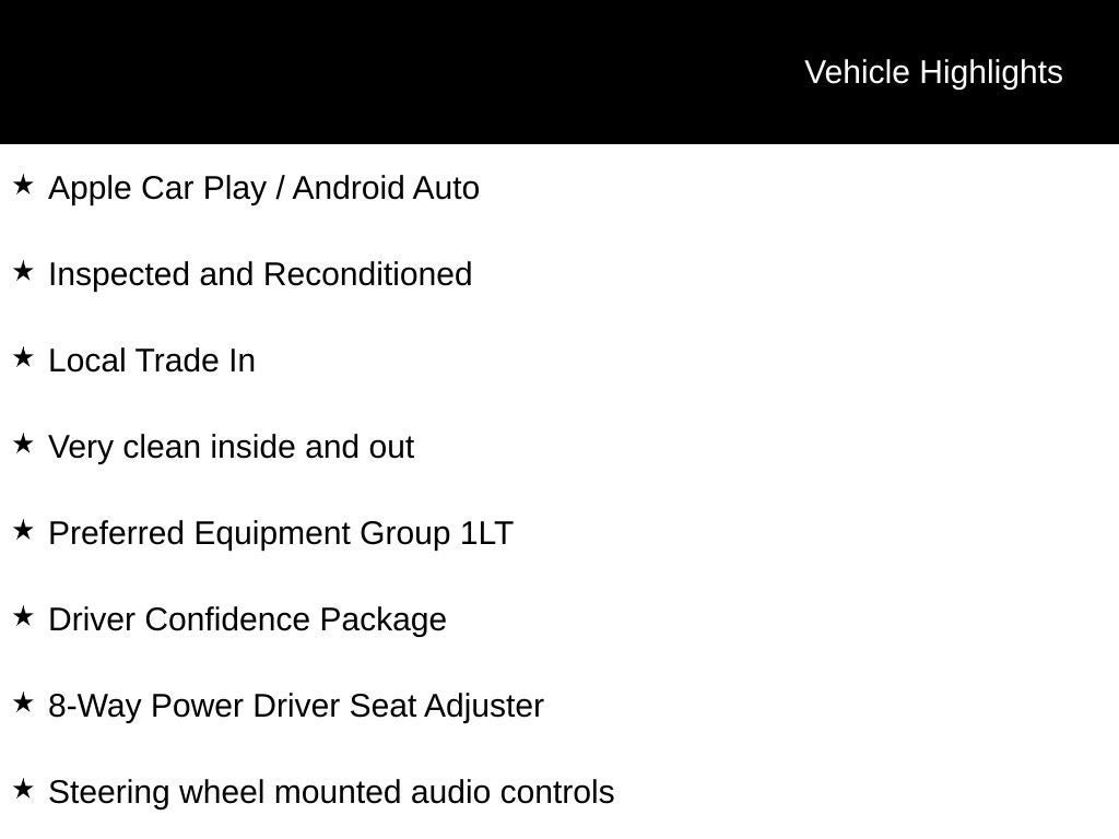 - Audio system, Chevrolet Infotainment 3 system 7" diagonal color touchscreen, AM/FM stereo. Additional features for compatible phones include: Bluetooth audio streaming for 2 active devices, voice command pass-through to phone, Apple CarPlay and Android Auto capable. (8" screen when (ZL3) Convenience Package and (ZL5) Driver Confidence Package or (SOR) Confidence II Package are ordered.)